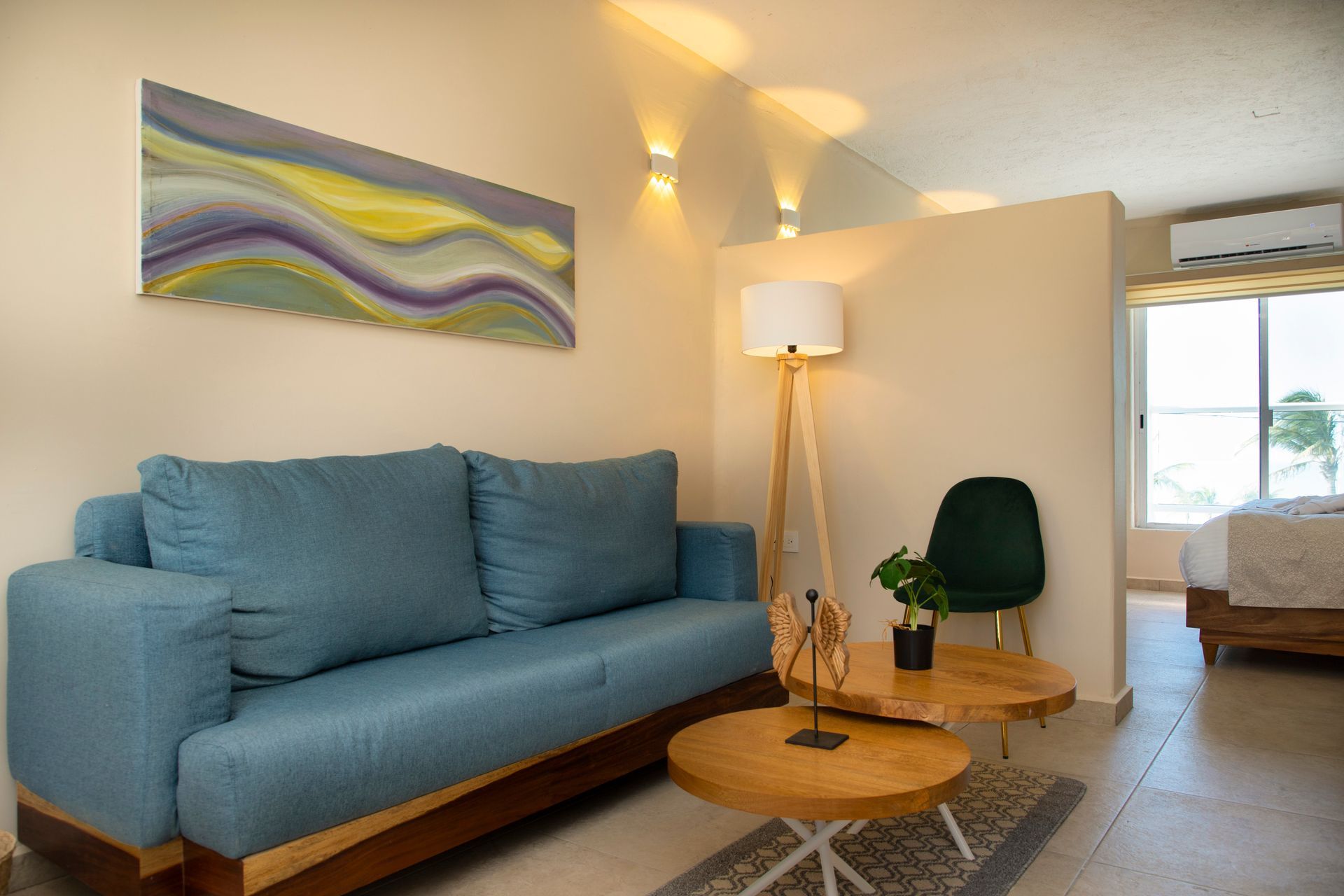1 King bed, living room, air conditioning, cable TV, ironing kit upon request, microwave oven, coffee maker, minibar with cost, private bathroom and shower, bathroom kit and special amenities. Front view to the sea.